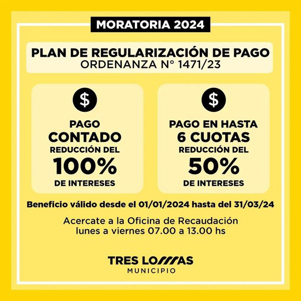 La Municipalidad de Tres Lomas informa a la comunidad que, abonando el año completo en un único pago, tendránn un 20% de descuento en las tasas municipales. El beneficio estará vigente hasta el 30 de marzo de 2024.