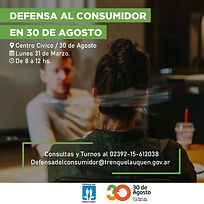 La Oficina de Defensa al Consumidor atenderá en 30 de Agosto el próximo día lunes 31 de Marzo de 8 a 12 Horas en las Oficinas del Ente Descentralizado. Se pueden reservar turnos al contacto 2392 -612038...