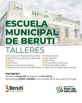La Escuela Municipal de Beruti informa que a partir del próximo lunes (23) abre la inscripción para los cursos y talleres anuales para adultos y niños a partir de los 6 años que se dictarán en la sede de la institución. Los interesados pueden acercarse de lunes a viernes de 8 a 12 a la Escuela Municipal o comunicarse al WhatsApp (2392) -448389. Al momento de la inscripción se les solicitará nombre...