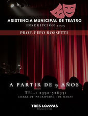 La Municipalidad de Tres Lomas informa que está abierta la inscipción a la Asistencia Municipal de Teatro las cuales estarán a cargo del profesor Pepo Rossetti. Plazo de inscripción: hasta el 7 de marzo. Destinado a personas a partir de los 9 años. Para más información e inscripciones, contactarse a 2392-528931....